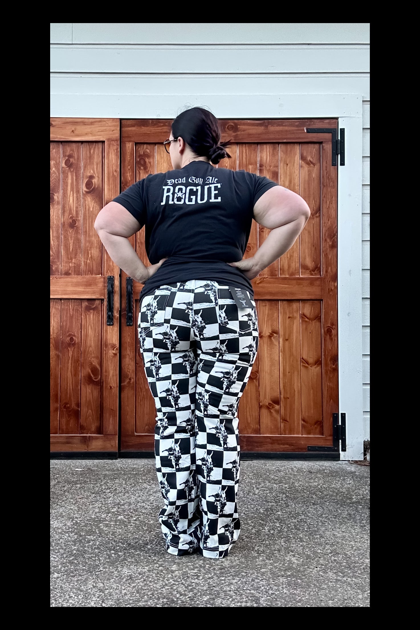 Make a bold Western statement with these standout checkerboard trouser jeans featuring a high-contrast black and white cowboy rodeo print. Designed for the modern cowgirl with vintage flair, these pants combine classic Americana motifs with contemporary street-style edge. Crafted from sturdy stretch denim for comfort and ease of movement, the trouser silhouette flatters all body types while the high-rise cut ensures a secure, confident fit. The all-over checkerboard grid showcases cowboy and bucking horse illustrations - giving a nod to rodeo roots and ranch heritage. Perfect for pairing with pearl snap shirts, graphic tees, or denim corsets, this style is a must-have for boutique owners looking to stock eye-catching pieces that blend tradition with trend. Lucky & Blessed western wear Lucky & Blessed Cowgirl rodeo High Rise Tummy Control Reinforced Belt Loops Butt Shaping Gap Control NFR WESTERN RODEO